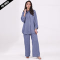Denim–linen blend shirt with a collared neck and front button-through opening featuring an embroidered placket. Includes 3/4 wide sleeves. Paired with pull-on linen trousers with side pockets.